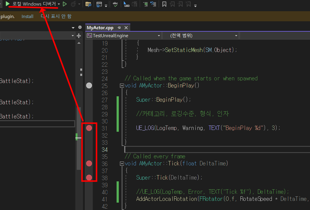 - 언리얼 에디터창을 끄고, 브레이크 포인트를 잡은 후 Windows 디버거를 실행하면 언리얼 에디터가 다시 켜짐