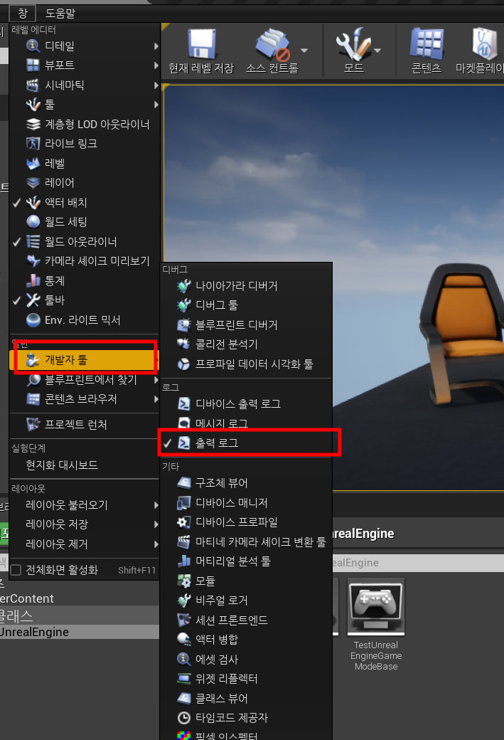 만약 출력 로그창이 없다면. 창 -> 개발자 툴 -> 출력 로그 클릭하면 창이 뜹니다.
