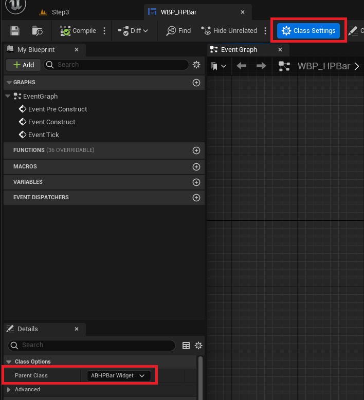 그럼 이곳에 Class Settings가 있는데, 여기서 우리가 만든 UserWidget 클래스를 등록해준다.