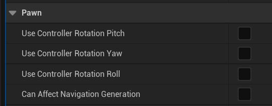 최상위컴포너트에서 Pawn 카테고리의 Use Controller Rotation Yaw를 꺼준다. 캐릭터가 카메라를 따라서 회전하지 않게 해준