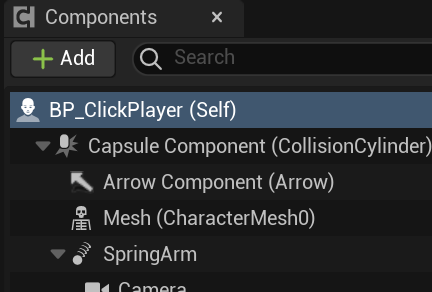 캡슐컴포넌트 아래 Spring Arm 컴포넌트를 추가해줍니다. Inherit Pitch, Yaw, Roll을 체크해제해 캐릭터를 따르지 않고 월드좌표계를 따르게 해줍니다.