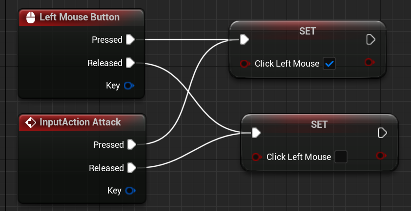 좌클릭 이벤트에 변수를 설정한다. 미리만들어 놓은 좌클릭 이벤트가 있다면 사용해도 된다. 블러거는 좌클릭시 Attack라는 인풋액션이 있어 연결해 보왔다.