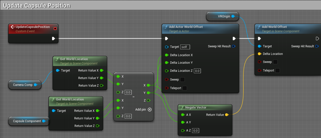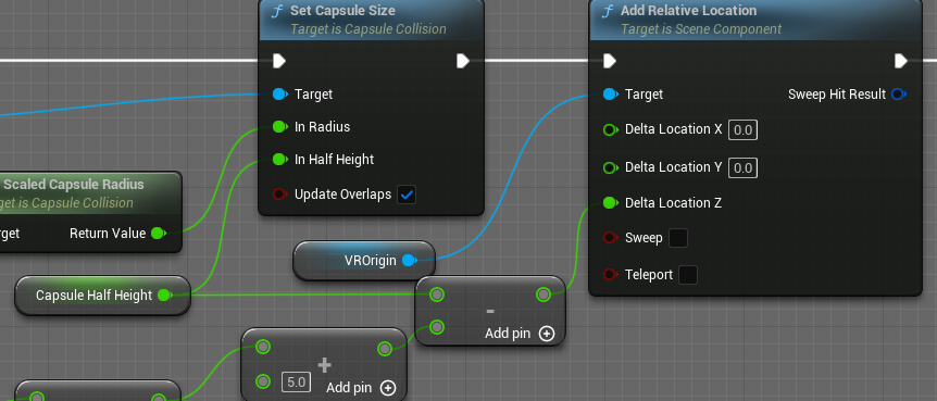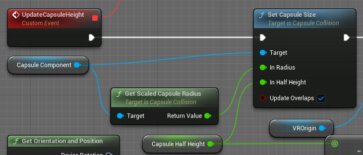 UpdateCapsuleHeight의 전체 노드이다. 결론은 변화하는 VROrigin의 높이값에 맞춰 CapsuleSize를 계속 변경해준면서 VROrigin은 relative Z position이 -5~0사이를 떤다. 왜그런지는 모르겠다.