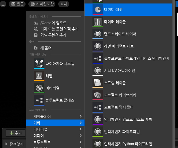 추가 -> 기타 -> 데이터 에셋을 누릅니다.