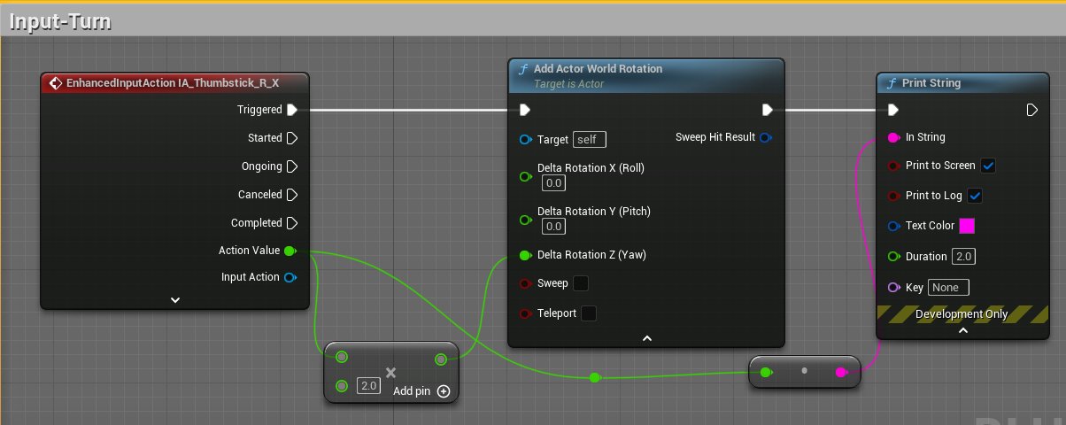 다음은 회전이다. VR에서 회전은 보통 오른쪽 썸스틱을 사용한다. Z축 데이터만 사용해서 AddActorWorldRotation을 해주면 된다.