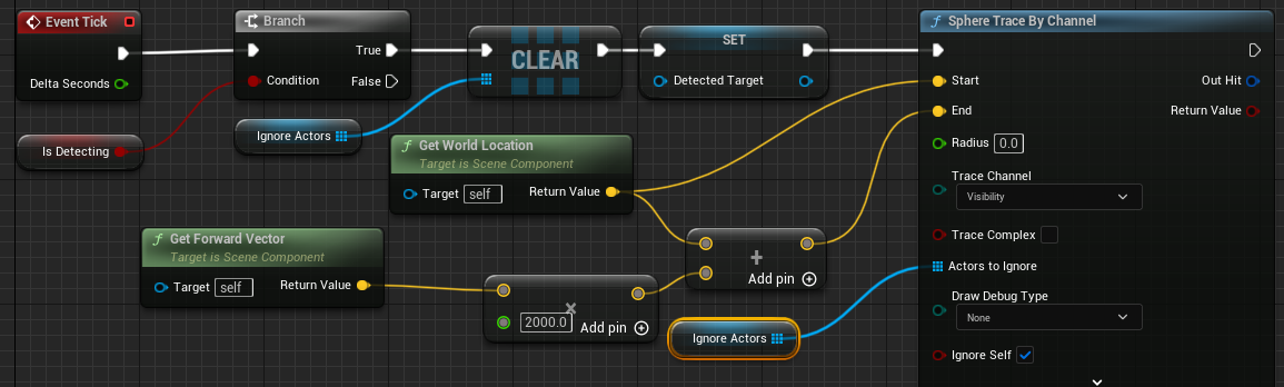 변수들을 만든다. IgnoreActors는 배열로, IsDetecting은 컴파일후 True로 한다