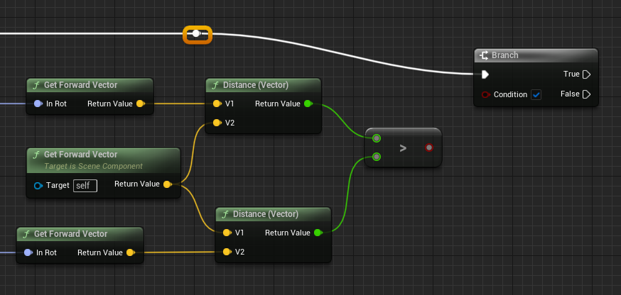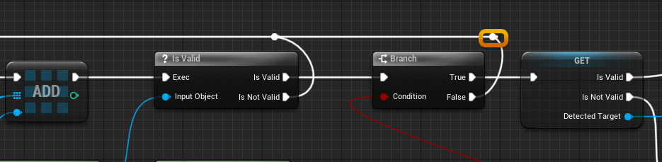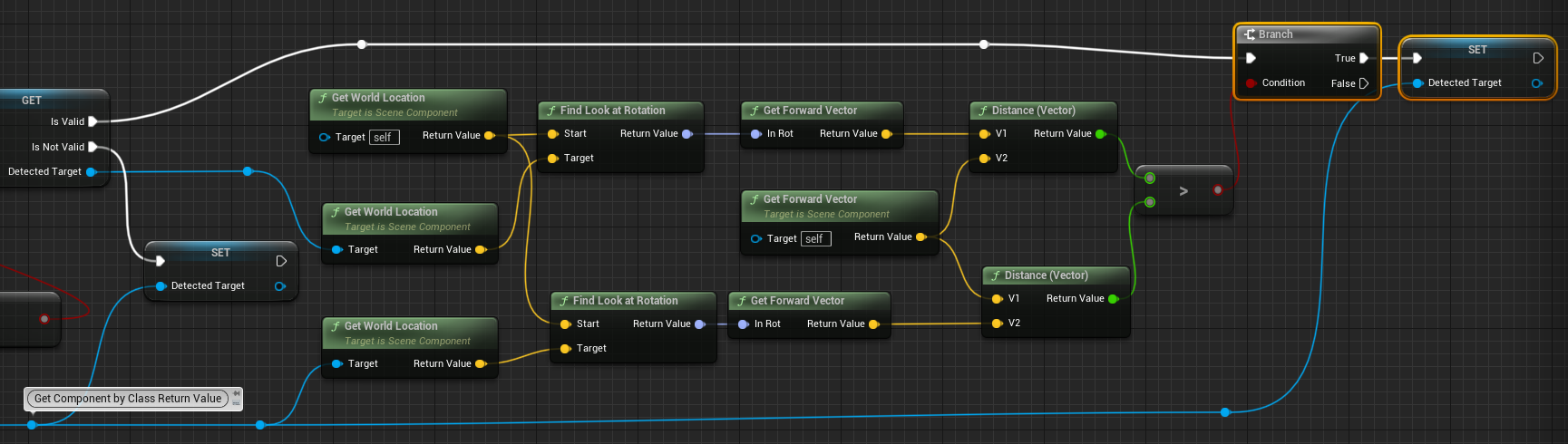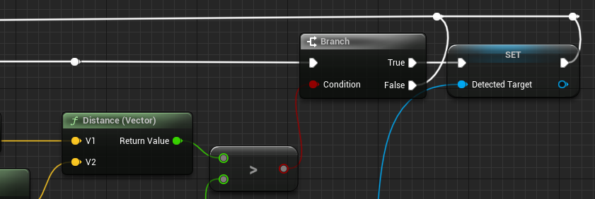 Brach노드를 맨뒤에 추가하고 앞쪽의 Detected Target의 IsValid를 끌어다 연결한다. >와Condition을 연결해준다. 이전이 크면 유효하다.