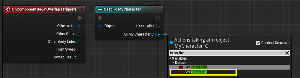 - 노드를 추가한 상태로, As My Character C 핀을 끌어 놓으면 그 안의 이벤트, 변수, 함수 등을 접근할 수 있습니다 (이 경우 Set Is on Fire).