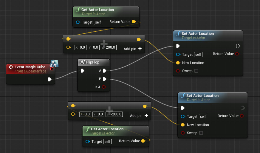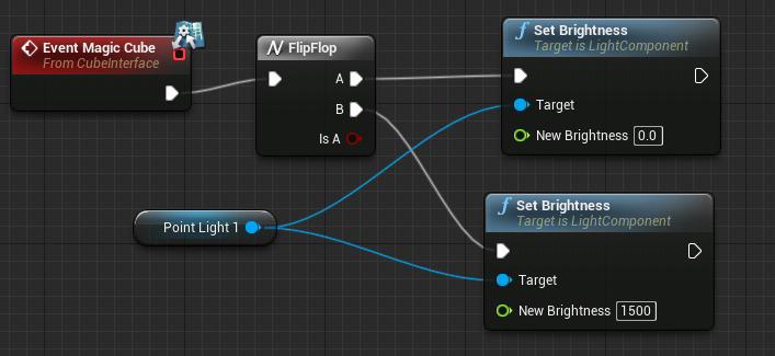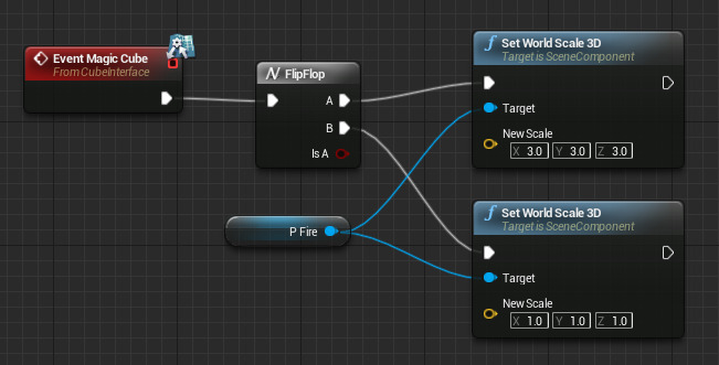 위 예제에서 볼 수 있듯이, 블루프린트 인터페이스 를 사용하면 각기 다른 블루프린트 유형과 단번에 통신할 수 있으며, 동일한 소스(여기서는 트리거)를 통해 각기 다른 함수를 수행하도록 할 수 있습니다.