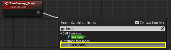 - TakeDamage_Event 바인딩된 이벤트를 끌어 놓고, GetHealth 인터페이스 메시지를 추가합니다.잊지 말고 인터페이스 메시지 를 구현하지만, 함수 호출 은 아닙니다.