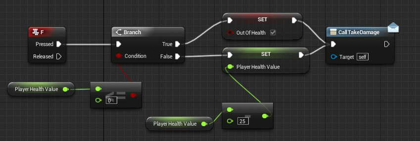 - MyCharacter 블루프린트의 이벤트 그래프 로 돌아가서 아래 셋업을 다시 만들어 줍니다.플레이어의 생명력이 0 보다 크고 플레이어가 F 를 누르면, 현재 생명력 값에서 25 를 뺀 다음 TakeDamage 라는 이벤트 디스패처 를 호출합니다. 생명력이 0 이하라면 OutOfHealth 라는 부울 변수를 True 로 설정하고, TakeDamage 라는 이벤트 디스패처 를 호출합니다. 여기서 이벤트 디스패처 를 사용하여 다른 블루프린트에게 플레이어가 대미지를 입었음을 알릴 뿐, 다른 블루프린트에서 Event Tick 을 사용하여 매 틱마다 플레이어의 생명력을 검사하도록 하지는 않습니다.