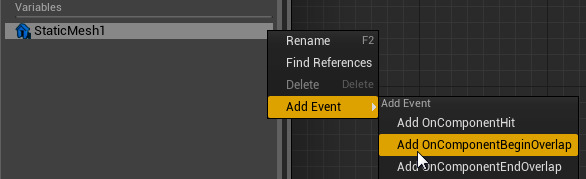 - 큐브 블루프린트를 연 다음 스태틱 메시 에 우클릭한 뒤 OnComponentBeginOverlap 이벤트를 추가합니다.