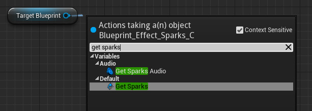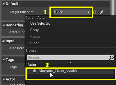 아이콘을 클릭한 다음, 레벨에 배치된 오브젝트를 클릭해도 됩니다.Target Blueprint 는 변수 유형 에 지정된 타깃으로만 (여기서는 Blueprint_Effect_Sparks) 설정할 수 있습니다.