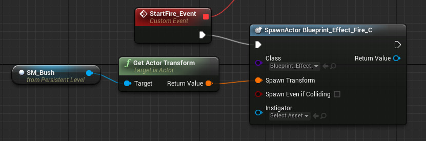 - StartFire_Event 를 끌어놓고 SpawnActorFromClass 노드를 추가한 다음 (클래스는 Blueprint_Effect_Fire 로 설정) Transform 에는 SM_Bush 트랜스폼을 구해줍니다.