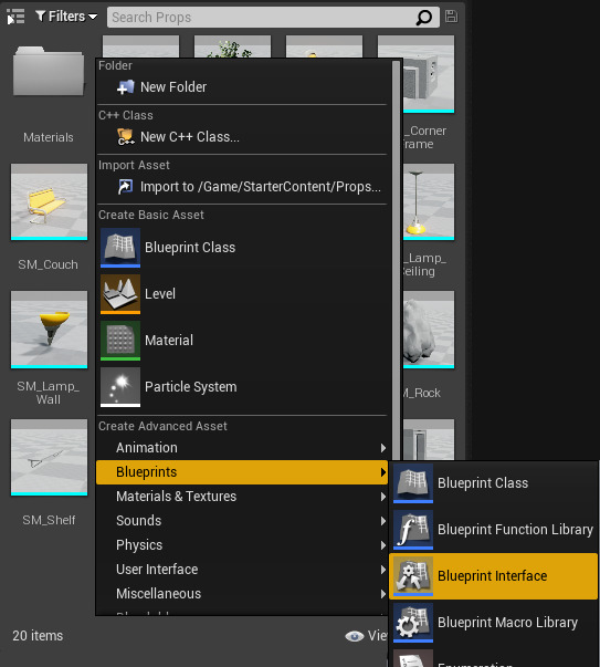 - 콘텐츠 브라우저 에서 빈 공간에 우클릭 한 다음 블루프린트 - 블루프린트 인터페이스 를 선택합니다.