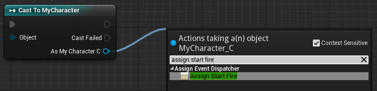 - As My Character C 를 끌어놓고 Start Fire 이벤트 디스패처를 할당합니다 (바인딩된 이벤트가 새로 생성됩니다).