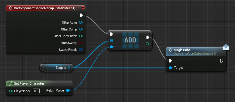 - Targets 를 MagicCube 노드에 연결하고, Get Player Character 노드를 Add 노드에 연결합니다.