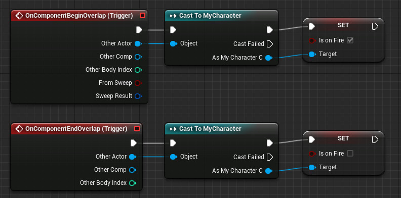 - Blueprint_Effect_Fire 블루프린트의 두 이벤트 모습은 이럴 것입니다.불에 겹치면 MyCharacter 블루프린트의 IsOnFire 변수를 True 로 설정하고, 더이상 겹치지 않으면 False 로 설정합니다. MyCharacter 블루프린트 안에서, 화염 블루프린트를 통해 IsOnFire 가 True 로 설정되면, 화면에 Apply Damage 를 출력합니다 (아니면 헬쓰/대미지 시스템이 있는 경우, 대미지를 적용하여 플레이어의 헬쓰를 깎을 수도 있습니다).
