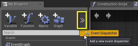 - MyCharacter 블루프린트 안에서 이벤트 디스패처 아이콘을 (숨겨져 있어 안보이는 경우 >> 버튼을 누른 다음) 클릭합니다. 이름은 StartFire 라 짓습니다.