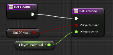 - 그래프에서 OutOfHealth 와 PlayerHealthValues 를 끌어 놓은 다음 아래와 같이 ReturnNode 에 연결합니다.그러면 MyCharacter 블루프린트에 저장된 값이 인터페이스에 전달됩니다.
