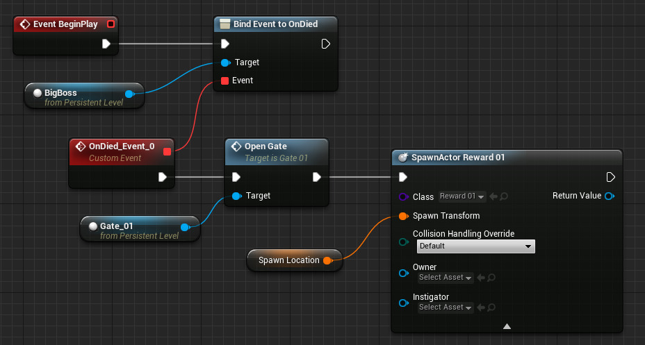 예를 들어 게임에 죽으면 "OnDied" (사망시) 이벤트 디스패처를 호출하는 보스가 있다고 칩시다. 그 OnDied 이벤트를 다른 블루프린트에 Bind (바인딩) 하면 여러가지 작업을 할 수 있습니다. 예를 들어 캐릭터에 하면 축하 동작을 하고, 문에 하면 열리고, HUD 에 하면 어떤 UI 메시지가 반짝이는 것입니다. 이 모두 보스가 죽었다는 OnDied 노티파이를 받을 때 실행되는 것입니다.