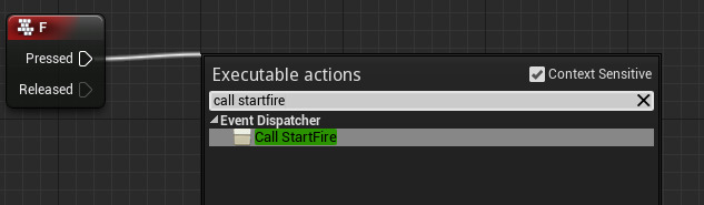 - 그래프에 우클릭 한 다음 F 키 이벤트를 추가하고, Pressed 를 끌어 놓은 다음 Call StartFire 이벤트 디스패처를 검색하여 추가합니다.