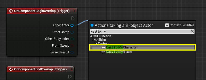 - 이벤트를 추가한 상태로, Other Actor 핀을 끌어 놓은 다음 검색창에 Cast To My 를 입력합니다.여기서 이벤트를 발동시키고자 하는 액터 (MyCharacter 블루프린트)를 검사/할당한 다음 Cast To 시켜서 화염 블루프린트에서 접근할 수 있도록 해 줬습니다.