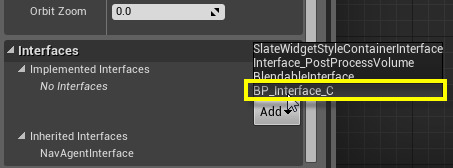 - 디테일 패널에서 인터페이스 아래 추가 버튼을 클릭한 다음 인터페이스(여기서는 BP_Interface_C) 를 선택합니다.