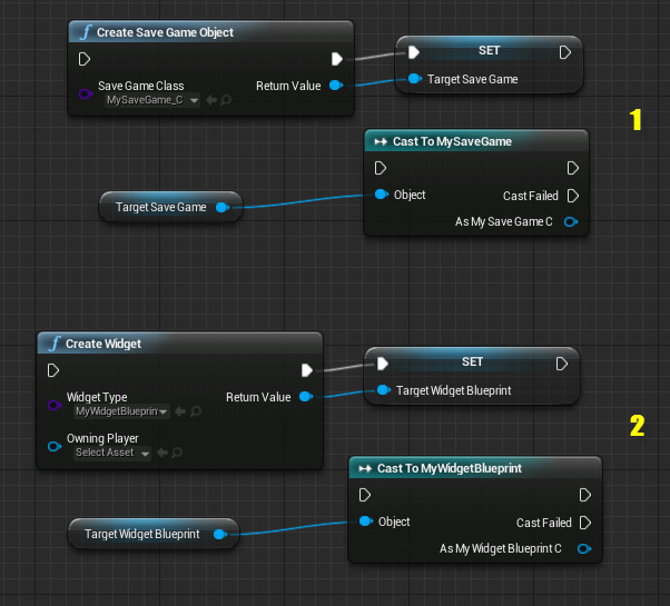 위 그림에서 1 번의 경우, Save Game Object 가 생성되어 SaveGameObject 변수에 할당됩니다. 그리고 그 변수가 MySaveGame 이라는 세이브 게임 블루프린트로 형변환하는 데 사용되어, 최고 점수, 최고 기록 등의 세이브 게임 정보를 전달 또는 받을 수 있습니다.