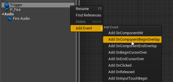 - Blueprint_Effect_Fire 블루프린트 안에서, 트리거 에 대한 두 개의 이벤트, OnComponentBeginOverlap 와 OnComponentEndOverlap 를 추가합니다.