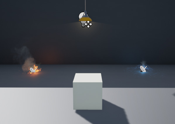 아래에는 레벨에 블루프린트 가 넷 있습니다: 트리거 역할을 하는 큐브, 화염 이펙트, 스파크 이펙트, 그리고 매달린 라이트 입니다. 라이트와 스파크 각각은 플레이어가 큐브에 들어섰을 때 각기 다른 일을 하도록 하고 싶습니다. 큐브에 들어갈 때마다 캐릭터의 이동 속력을 올리고도 싶습니다.