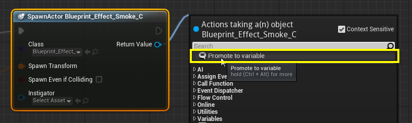 Spawn Actor from Class 노드를 사용할 때, 그 Return Value 를 끌어 놓은 다음 변수로 할당할 수 있습니다.
