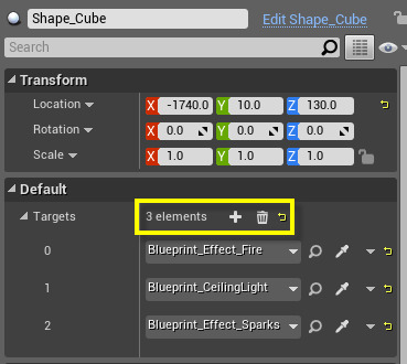 - 레벨에서 큐브를 선택하고, 디테일 패널에서 타깃 아래 + 부호를 클릭한 다음 레벨에 있는 화염, 라이트, 스파크를 추가합니다.