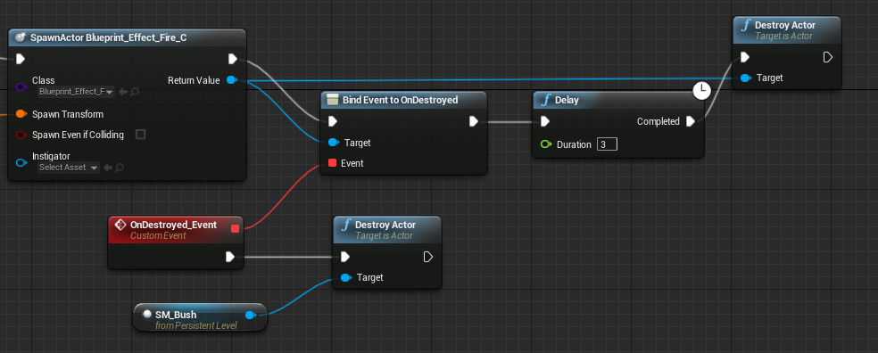 이는 물론 단순한 예제로, 플레이어가 덤불 근처에 있어야 불을 붙일 수 있도록 한다든가, 불은 한 번만 붙일 수 있다든가 등등, 보다 많은 검사를 했으면 좋을 것입니다. 하지만 캐릭터 블루프린트 에서 이벤트 디스패처 를 사용하여 레벨 블루프린트 안의 이벤트를 실행하는 법을 보여주는 데는 충분합니다. 스폰된 액터에 이벤트 디스패처 를 할당하여, 그 액터에 무슨 일이 생겼을 때 (여기서는 소멸되었을 때) 이벤트를 실행하도록 하는 법도 보여주고 있습니다.