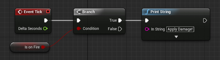 - 이제 우리 타깃이 MyCharacter 블루프린트임을 알았으니, 플레이어가 Is on Fire (불이 붙었는지) 나타내는 부울 변수를 만듭니다.위에서 Every Tick 은 분기 에 물려 True 인 경우 Apply Damage 를 화면에 출력합니다 (True 다음이 대미지 적용 스크립트가 있을 곳입니다).