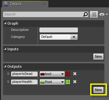 - 새로운 함수 이름은 GetHealth 라 지어주고, 디테일 패널에서 추가 버튼을 클릭하여 출력 을 두 개 추가합니다.