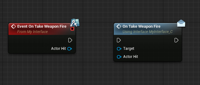 인터페이스는 일종의 계약입니다. "이 인터페이스를 구현하면, 너는 여기 지정된 함수를 구현하고, 내가 호출하면 거기에 반응한다고 약속한다"는 것입니다. 여러 블루프린트에서 하나의 인터페이스를 구현할 수는 있지만, 연관이 있는 것들만 반응합니다 (연관이 없는 것들은 그냥 호출을 무시합니다). 무기 발사 예제로 돌아가서, 벽이 대미지에 반응하지 않도록 하려면, 그냥 OnTakeWeaponFire 로 인터페이스를 구현하지 않으면 될 것입니다.