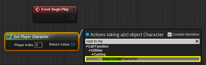 - 우클릭 후 Event Begin Play 노드와 Get Player Character 노드를 추가한 다음, Get Player Character 를 Cast To MyCharacter 합니다.