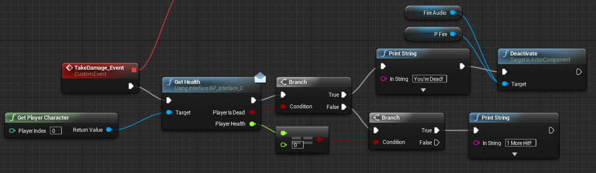 - 여기서 GetHealth 인터페이스가 일련의 분기 노드로 연결되어 먼저 (MyCharacter 블루프린트에 정의되어 있는) PlayerIsDead, 플레이어가 죽었는지 검사하고, 그렇다면 화면에 텍스트를 출력하고서 화염 이펙트/오디오를 비활성화시킵니다.