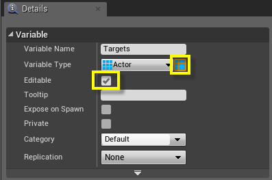 - Targets 라는 액터 변수를 새로 만든 다음, 변수 유형 옆의 박스를 클릭하고 배열 로 만들어 준 뒤 편집가능 박스를 체크합니다.블루프린트 인터페이스 영향을 받은 액터가 저장됩니다.
