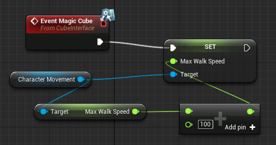 - MyCharacter 블루프린트에 블루프린트 속성 을 추가하는 작업을 반복한 다음 CubeInterface_C 를 추가합니다.큐브에 들어설 때마다 캐릭터의 이동 속력을 100 씩 증가키시고 있습니다.