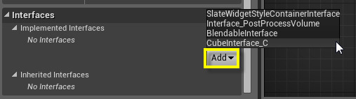 - 디테일 패널에서 인터페이스 아래, 추가 버튼을 클릭하고 인터페이스 (여기서는 CubeInterface_C) 를 선택합니다.