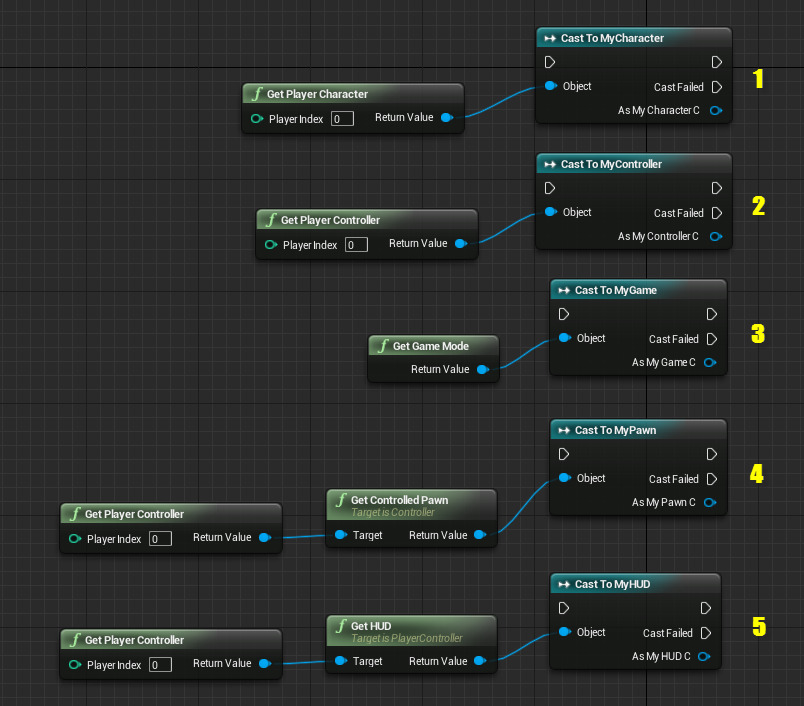 | Game Mode (3) | Get Game Mode 노드가 사용되어 MyGame 이라는 게임 모드 블루프린트로 형변환하고 있습니다. |