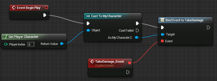 - 이벤트 그래프 에서 이벤트를 MyCharacter 블루프린트의 TakeDamage 이벤트에 바인딩합니다.Get Player Character 노드를 끌어 놓고 Cast To MyCharacter 한 다음, As My Character C 를 끌어 놓고 Assign Take Damage 하여 바인딩된 이벤트를 만듭니다.