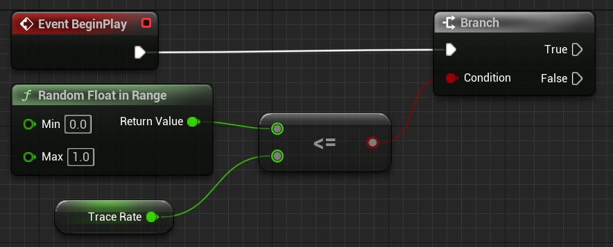 이벤트그래프에 난수를 만들어주는 Random Float in Range 노드를 추가하고 범위를 0~1하고 이걸 Trace Rate와 비교해서 작으면 Player로 향하는 방향을 설정해 보겠습니다. 다음과 같이 노드를 만들면 됩니다.