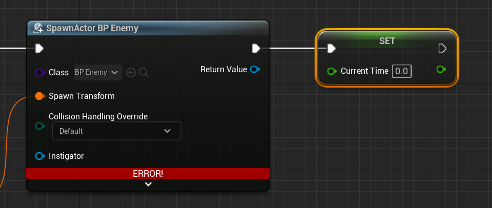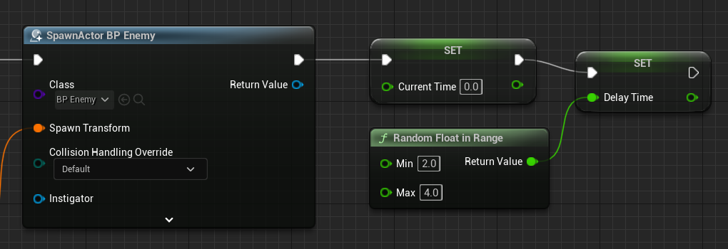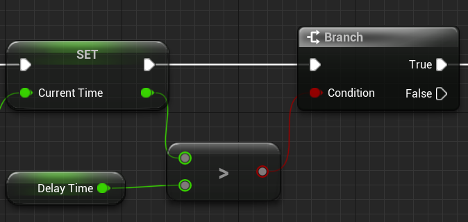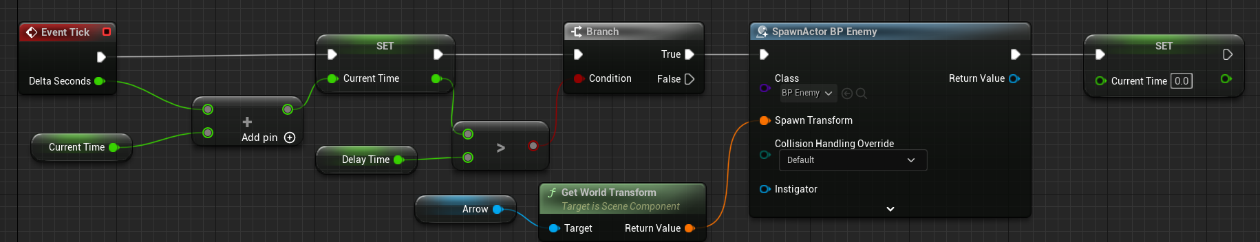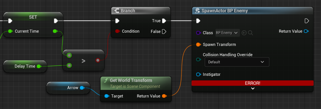 이제 currentTime이 delayTime보다 커지면 Spawn하는 로직을 연결해 보겠다. DelayTime변수를 추가후 > (greater)노드를 추가하고 결과를 Branch노드와 연결해준다. 언리얼에서 Branch는 if문이다.
