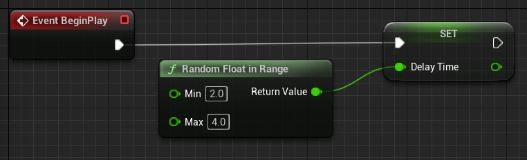 각각의 인스턴스의 delayTime을 다르게 했지만 역시 고정된 값이라 불규칙성 주려면 Event Begin Play에 다음과 같이 Random으로 DelayTime을 설정해도 되고