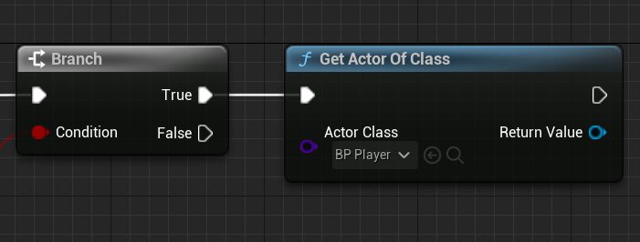 Branch True 실행핀에 GetActorOfClass 노드를 추가하고 Actor Class를 BP_Player로 해줍니다. 언리얼에서 외부의 블루프린트 클래스를 참조할때 쓰는 방법입니다.