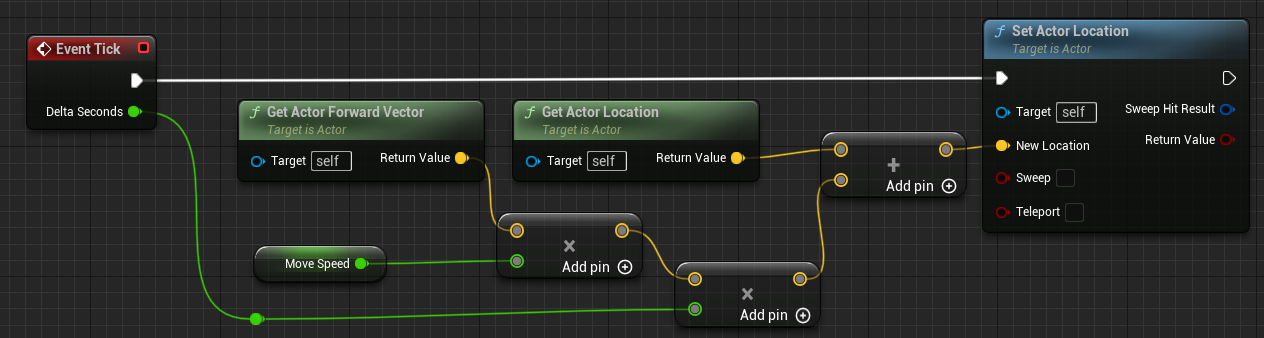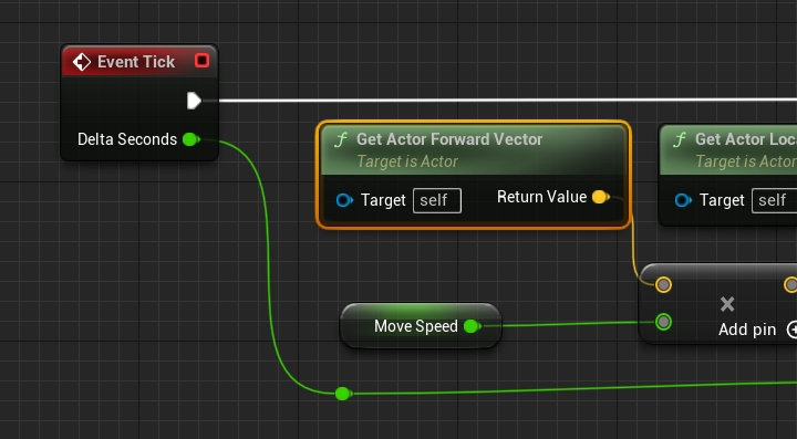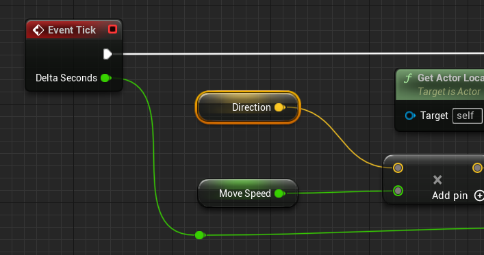 방향을 정했으니 그방향으로 이동하면 됩니다. Event Tick에 연결되어 있는 GetActorForwardVector를 지워주고 방금만든 direction을 get으로 추가해 줍니다.