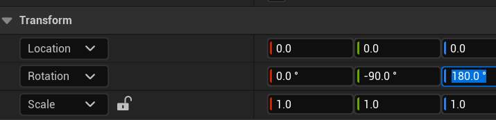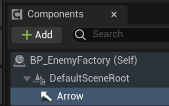 적이 생성될 지점을 만들기 위해 Components +Add에서 Arrow를 추가하고 Transform Y/Z Rotation을 -90/180로 하면 화살표가 아래로 향하게 된다.